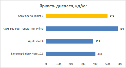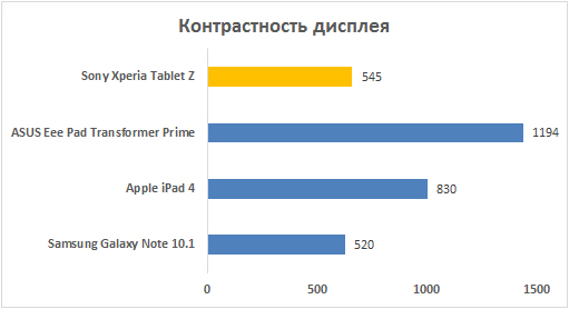 Максимальная светимость черного поля — 0,78 кд/м2 (в данном случае меньше — лучше). Это далеко не самый хороший показатель, но и не совсем плохой. На максимальном уровне подсветки черному не хватает глубины: черное поле выглядит темно-серым. В Xperia Tablet Z присутствует отключаемый фильтр Mobile BRAVIA Engine 2, делающий соответствующий цвет более глубоким, но ощутимого результата он не дает. Результирующая контрастность устанавливается на отметке 545:1, что не так много, как хотелось бы.