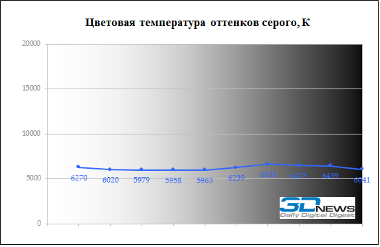 Цветовая температура находится в районе 6200 К, что очень близко к эталонному значению 6500 К. Максимальное отклонение от идеала для всех градаций серого составляет чуть более 500 К — мелочи. Картинка в меру тёплая — почти такая, какой и должна быть.