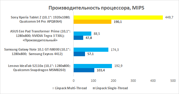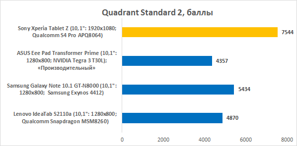 В сугубо процессорном мультипоточном задании Linpack чип продемонстрировал очень хороший результат — почти 450 MIPS. Четырехъядерный Exynos 4412 производства Samsung смог набрать в нем только 175 MIPS. В процессе повседневной работы планшет совершенно не тормозит, гладко отображает анимацию операционной системы, плавно переключается между окнами, держит открытыми множество программ. За неделю тестирования с Xperia Tablet Z не приключилось ни одного зависания, которое «лечилось» бы перезагрузкой, а количество подтормаживаний сведено к минимуму. Отчасти, правда, в этом есть заслуга добротно отлаженной прошивки, но и мощные потроха тоже играют немаловажную роль.