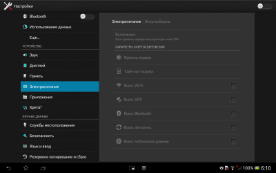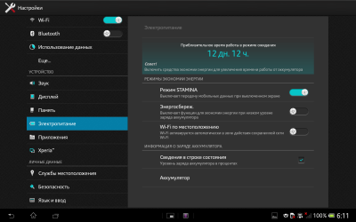 В соответствующем меню настроек есть гибкие параметры энергосбережения: фирменный режим STAMINA, отключающий передачу данных при выключенном экране, включение Wi-Fi при нахождении рядом со «знакомыми» сетями и выключение некоторых модулей, если уровень заряда опустился ниже определенного уровня. Комплектное зарядное устройство выдает силу тока 1,5 А — маловато. Заряжает Tablet Z оно примерно за шесть часов. Лучше использовать более мощные решения.