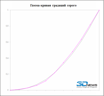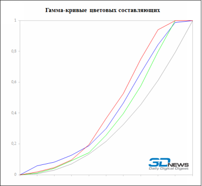 Гамма-кривая для градаций серого имеет небольшой прогиб в нижней части, что простительно — отклонение незначительное, и немного задрана в нижней и верхней частях, из-за чего светлые и средние оттенки выглядят немного ярче положенного. Впрочем, явных провалов нет ни в светах, ни в тенях. А вот гамма-кривые для цветовых составляющих на этом фоне смотрятся пугающе — отклонения от эталона чрезмерные. Судя по всему, Sony специально настроила дисплей таким образом, чтобы картинка на нем выглядела более красочной.