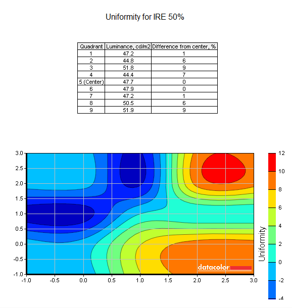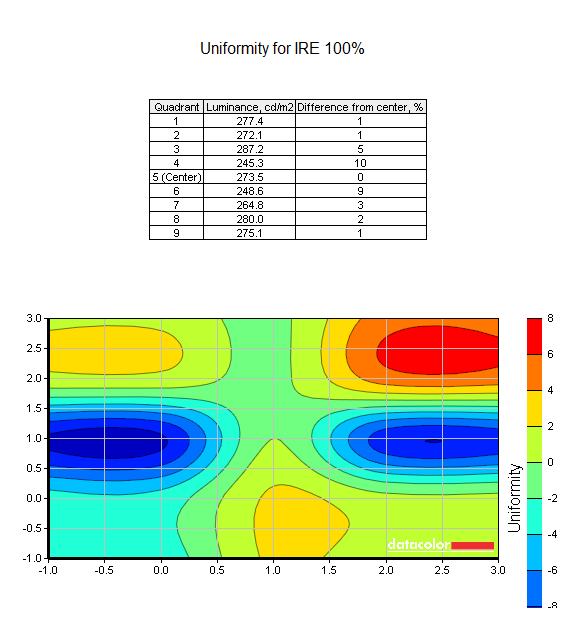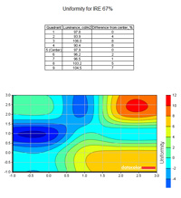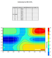 Равномерность подсветки по полю экрана оценивалась в том же режиме, в котором происходила калибровка. Результаты, особенно для монитора со светодиодной подветкой, не самые радужные. Наибольший разброс по полю экрана, наблюдающийся при 100% и 50% от максимума яркости, составляет около 18-19% — это уже неудовлетворительный результат. Что касается показателей при 83% и 67% от самого яркого значения, то здесь результаты чуть лучше: 14-15%, хотя это также очень и очень много.