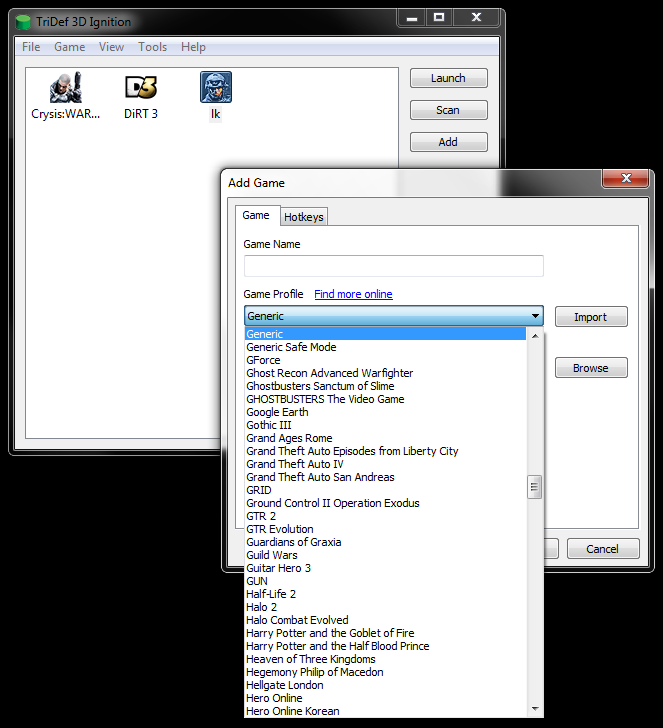 Для того чтобы использовать все функции монитора, в частности технологию трехмерного изображения, необходимо в первую очередь установить прилагающийся на компакт-диске драйвер для очков и синхронизатора затворов. Затем программа предложит определиться с частотой синхронизации: 50 или 60 Гц. После этого пользователь должен выбрать между просмотром фильмов и компьютерными играми. Если предпочитаете игры, то в появившемся окне драйвер сам найдет установленные на компьютере приложения, которые поддерживают 3D-формат, и выведет их списком. Если же по какой-то причине нужное приложение не будет найдено, всегда можно выбрать его самостоятельно в выпадающем списке. Стоит отметить, что список предлагаемых игр хоть и довольно обширен, похвастаться новизной не может: в него входят в основном приложения двух-трехлетней давности. Однако в самом окне программы есть ссылка Find more online, которая ведет на форум, где и можно скачать профили для более новых игр. Правда, часть профилей — результат творчества участников форума, так что не все они могут работать корректно.