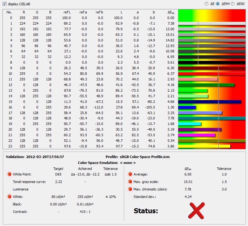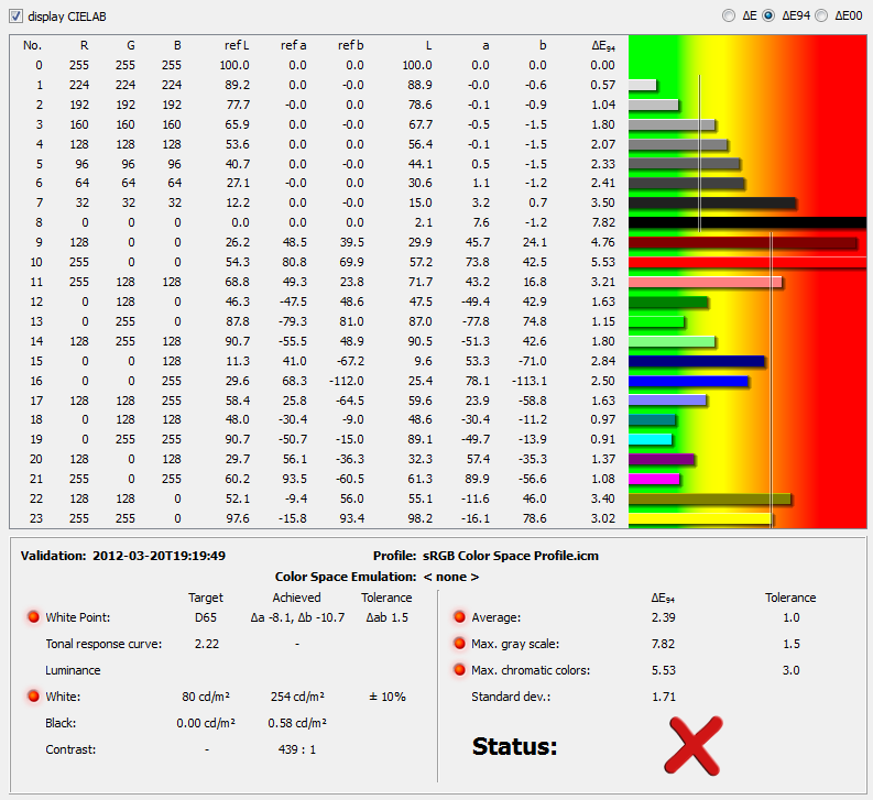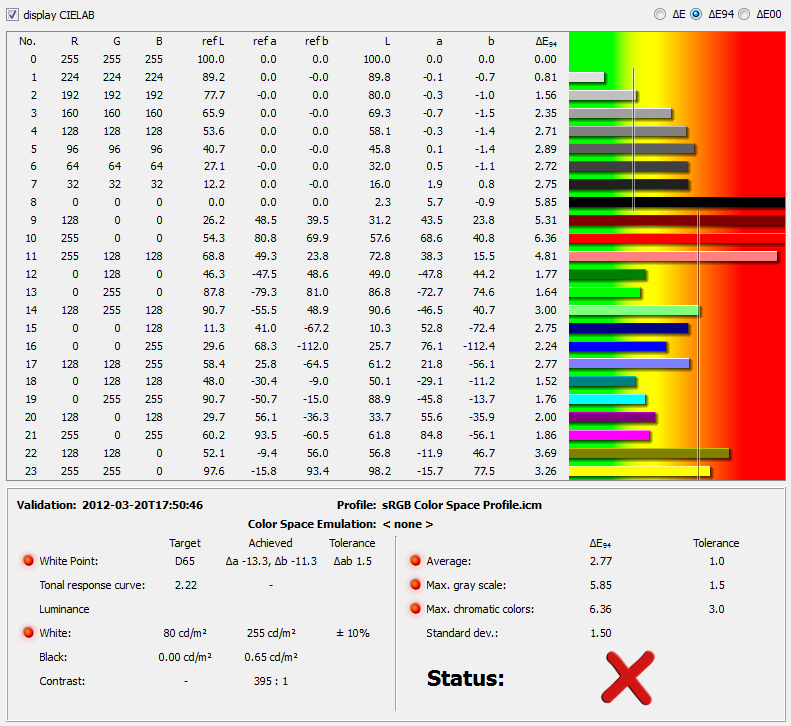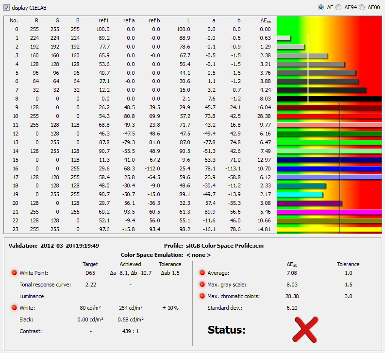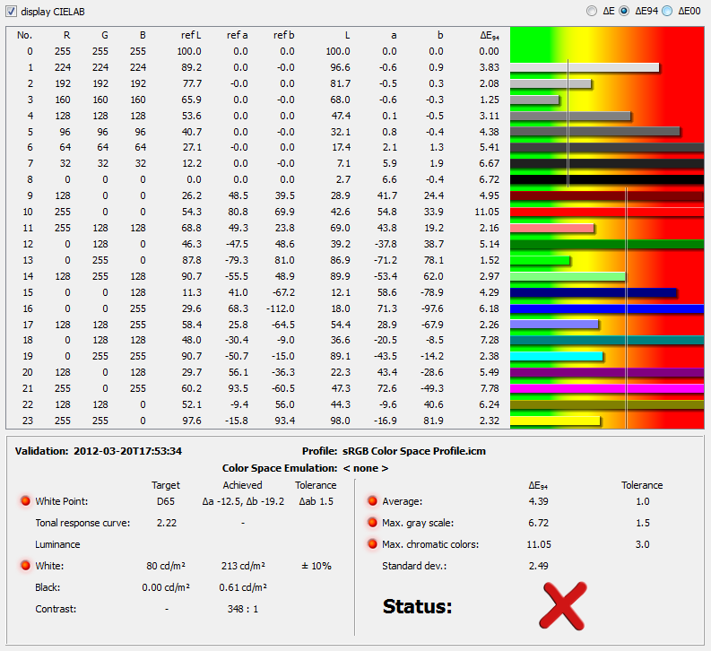 | Белая точка, CIE (x/y) | 0,283/0,312 | 0,312/0,330 | 0,313/0,329 |