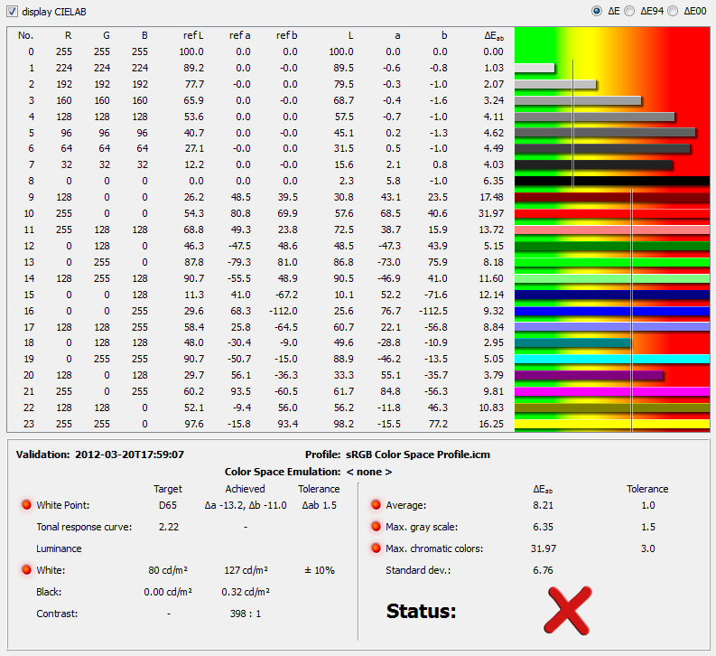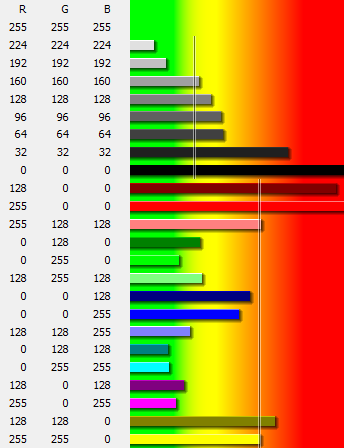 Точность цветопередачи буквально во всех режимах невпечатляющая. Пользовательская настройка с пресетами sRGB и 6500К показала себя лучше всех, среднее отклонение 6,9 и 7,08. Еще немного — и был бы более-менее приемлемый результат. Хуже дела обстоят у предустановок «Управление», «Фото» и «Экономичный», средний показатель ΔE составил около 8,4, это уже неудовлетворительно. Что касается режимов «Кино», «Игры» и пользовательской настройки с предустановкой цветовой температуры, соответствующей естественному режиму работы матрицы, то результаты, распределенные около значения 12,5, являются откровенно плохими.