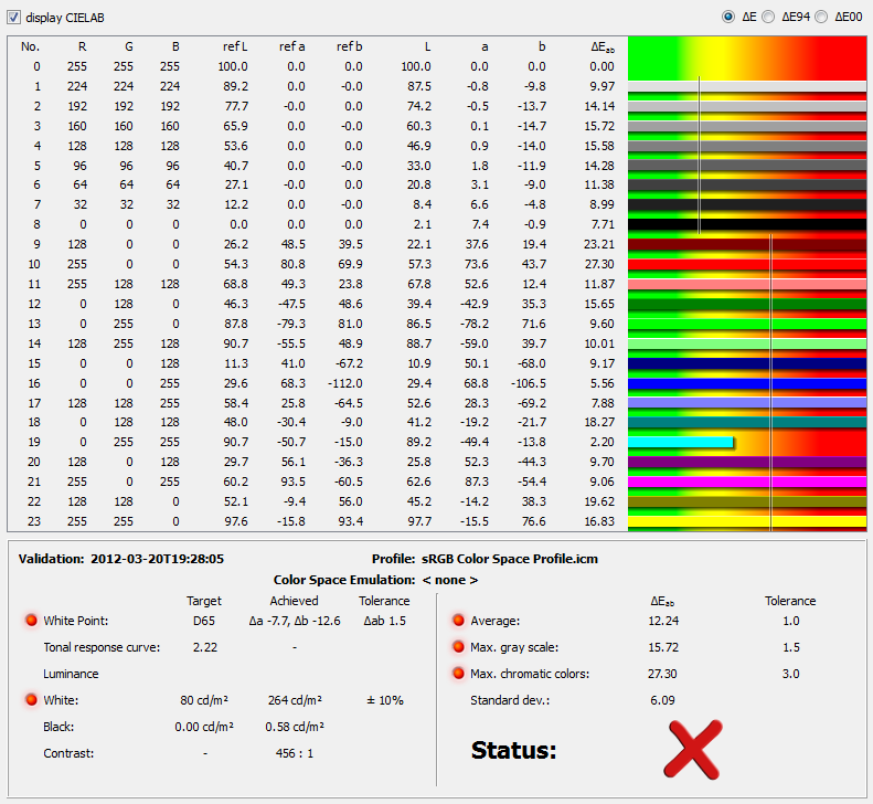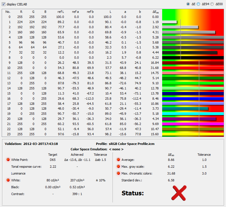 С помощью программы Spyder3Elite монитор был откалиброван в пользовательском режиме с предустановкой цветовой температуры, соответствующей естественному режиму работы матрицы, а именно с поканальной настройкой базовых цветов, установленной на 100% для каждого цвета. В таблице ниже приведены результаты до и после калибровки. Итак, что же удалось улучшить и за счет каких параметров? Значительно увеличилась точность цветопередачи (среднее отклонение уменьшилось с 12,24 до 2,95), это хороший показатель. Степень гамма-кривой точно сравнялась с эталонным значением 2,2. К сожалению, цветовой охват монитора довести до референсного не удалось, в зеленой области график почти совпадает с правильным значением, а вот в красной — серьезно не дотягивает до него. И как обычно, яркость снизилась с 264,9 до 206,1 кд/кв.м — весьма ощутимо. Поскольку яркость черного осталась неизменной, контрастность тоже упала с 456,7:1 до 355,3:1, это также неважный результат.