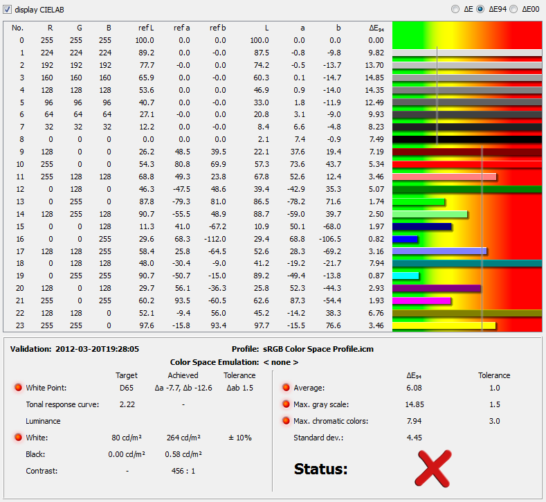 | Philips 273G3DH, после калибровки — точность передачи отдельных оттенков, ΔE | Philips 273G3DH, после калибровки — точность передачи отдельных оттенков, ΔE 94 |
