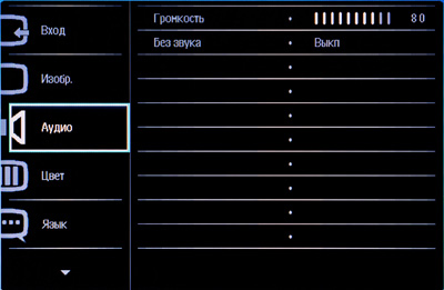 Подменю «Аудио» регулирует громкость звука и активирует режим «без звука».