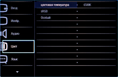 Настройки цвета выделены отдельным пунктом с аналогичным названием. Здесь можно выбрать предустановку цветовой температуры или настроить точку белого путем поканальной регулировки базовых цветов, а также выбрать цветовой охват, соответствующий цветовому пространству sRGB.