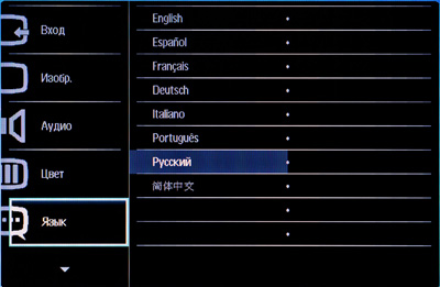 В подменю «Язык» можно выбрать одну из восьми языковых раскладок отображения меню.