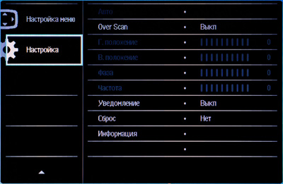 А в подменю «Настройка» можно получить информацию о мониторе, сбросить установки дисплея до заводских параметров, а так же настроить фазу и частоту аналогового сигнала.