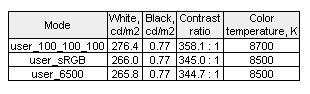 К сожалению, по результатам тестирования ни один режим не дотянул до паспортных значений яркости. Хуже всего показал себя режим «Кино», 133,4 кд/кв.м — это очень низкий результат. Даже «Экономичный» продемонстрировал большую яркость, хотя от него разумно было ожидать самых низких показателей. Далее следуют «Игры», «Управление», а лидирует среди пресетов режим «Фото» с 268,9 кд/кв.м. При этом контрастность почти для всех предустановленных режимов лежит в диапазоне от 349,1:1 до 526,4:1. Все это далеко от заявленных значений. Гораздо лучше проявил себя пользовательский режим с различными комбинациями цветовой температуры. В sRGB-режиме и с предустановкой 6500 К яркость составила 266 и 265,8 кд/кв.м соответственно, а в естественном режиме работы панели – 276,4 кд/кв.м. При этом контрастность также не может похвастаться хорошими результатами, в среднем ее значение составило 350:1. Если говорить о цветовой температуре, то ни один режим не смог вплотную приблизиться к референсным 6500 К. При этом среди готовых пресетов цветовая температура достаточно стабильна и колеблется в пределах 8500 К, и лишь режим «Кино» сильно выделяется своими 10000 К. Что касается ручных регулировок, то тут также царит постоянство, точка белого лежит в пределах 8600 К с разбросом не более 100К.