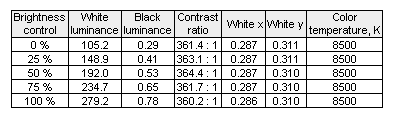 - яркость белого поля при различных значениях настроек яркости дисплея;