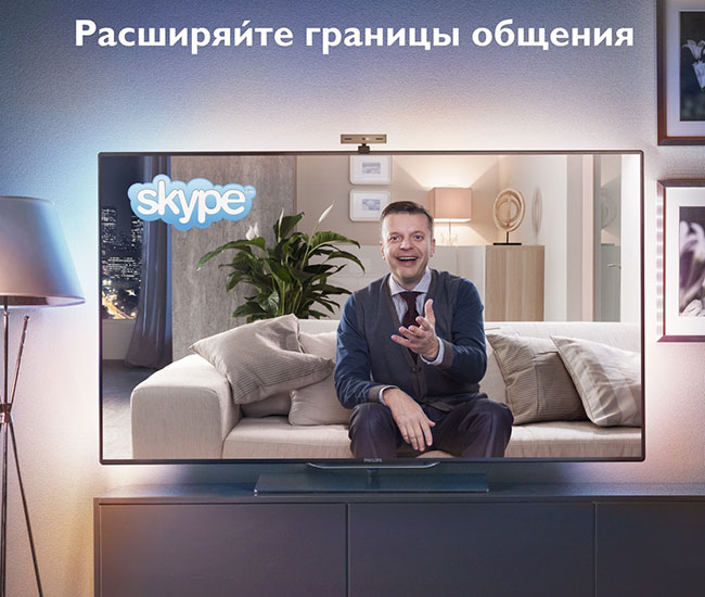 Возможностями Skype обладают все новые телевизоры Philips Smart TV 2013 года. Для общения с близкими, коллегами и друзьями достаточно установить интернет-соединение и подключить веб-камеру (в сериях 7000 и 8000 модельного ряда телевизоров 2013 года камера встроена в корпус телевизора; для прочих моделей камера приобретается отдельно).