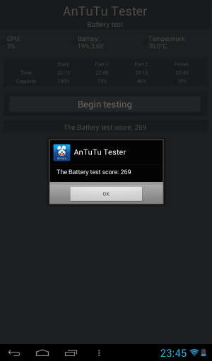 iconBIT NetTAB MATRIX ULTRA — результаты теста AnTuTu Battery Test (условия тестирования: 100%-я яркость экрана, 0%-й уровень звука, активное Wi-Fi соединение)