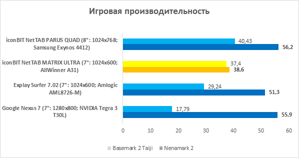 Удивительно, но в абсолютно разных по сложности «геймерских» тестах Nenamark 2 и Basemark 2 Taiji новинка показала примерно одинаковый результат — около 38 FPS. Более того, в визуальных частях заданий Quadrant 2 и AnTuTu Benchmark планшет не показывал больше 38 кадров в секунду, будто у него есть на это аппаратное ограничение. Возможно, процессор таким образом пытается экономить энергию. Однако с таким явлением мы сталкиваемся впервые и доподлинно объяснить причины его возникновения не можем.