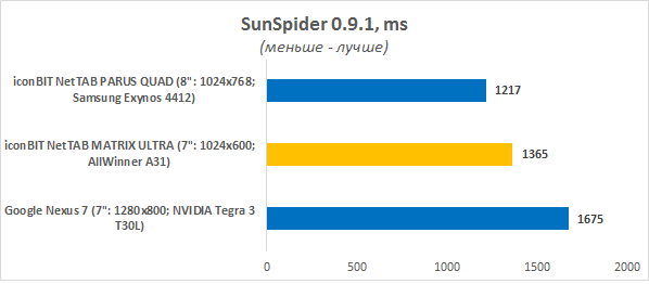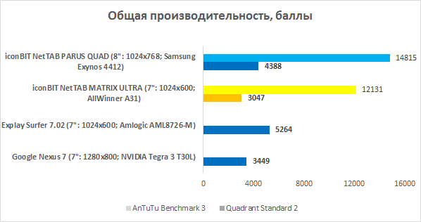 Процесс работы с iconBIT NetTAB MATRIX ULTRA можно охарактеризовать тремя наречиями — плавно, быстро, стабильно. Действительно, планшет очень гладко отображает анимацию операционной системы, переключается между приложениями, без глюков и зависаний выполняет ресурсоёмкие процессы. В синтетическом тесте Quadrant 2 новинка практически сравнялась с планшетом Google Nexus 7, работающим на небезызвестной системе на чипе NVIDIA Tegra 3 T30L, уступив ему всего лишь 402 балла.