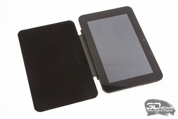 Расстраиваться, что стандартный комплект поставки не включает в себя защитный чехол, не приходится: задняя панель устройства представляет собой так называемый cover case. Чтобы начать пользоваться гаджетом, нужно «открыть» его, как книжку. Приятным сюрпризом для нас было то, что устройство умеет автоматически блокироваться при закрытии чехла, подобно тому, как это реализовано в «яблочных» планшетах. Может показаться странным, но Samsung Galaxy Note II с фирменным cover case, например, этому не научили.