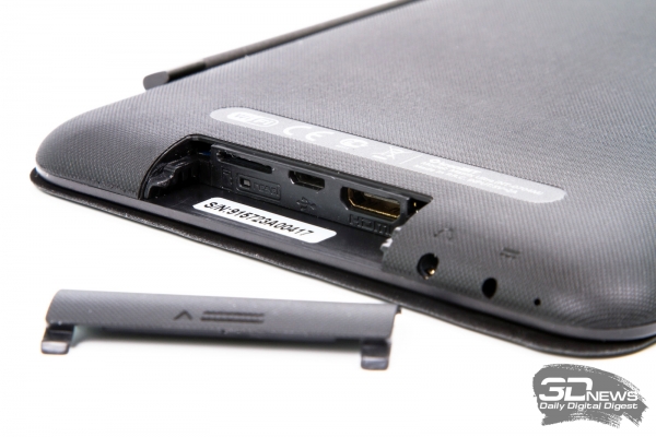 Заявленные в спецификациях разъемы сосредоточены на левой грани устройства. Здесь под пластиковой заглушкой находится слот для карточки памяти microSD, интерфейс microUSB и видеовыход microHDMI, а также 3,5-мм аудиоджек, разъем для подключения к зарядному устройству и чувствительная область микрофона, расположенные отдельно. Держателей у заглушки нет, из-за чего потерять её совсем несложно. Остальные грани планшета пустуют.