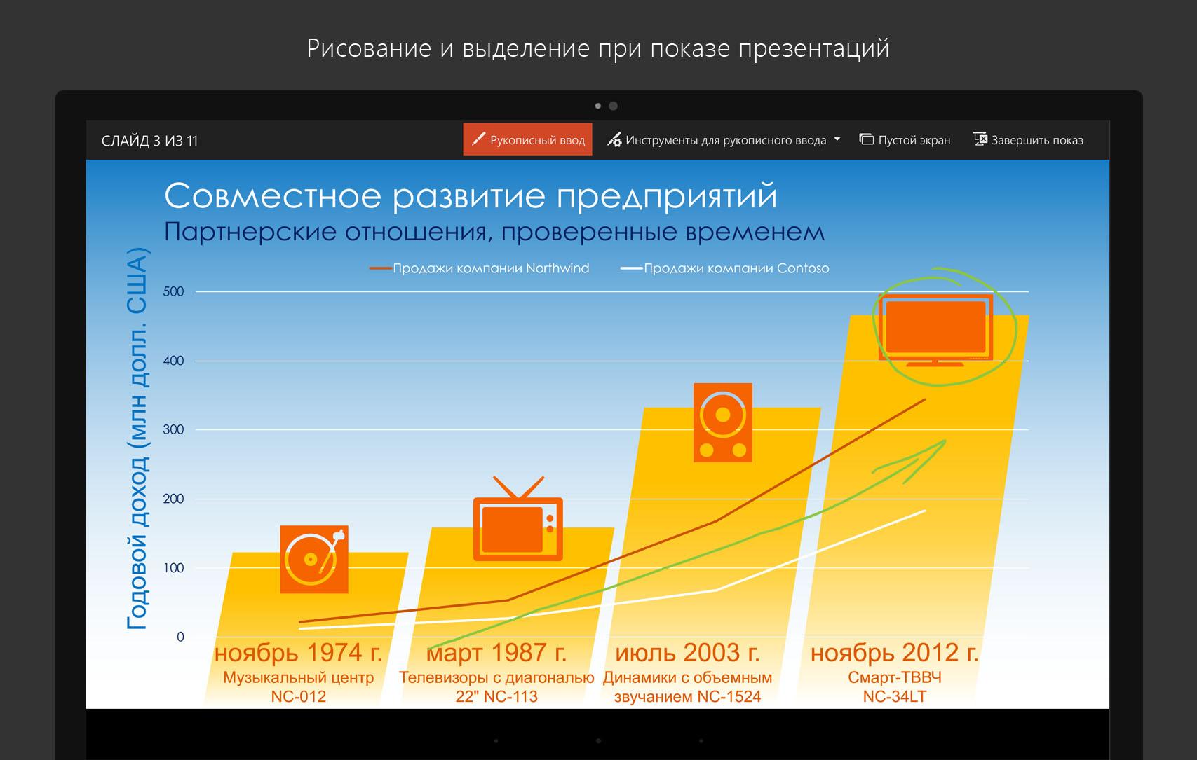 Мы пересмотрели каждое приложение и сделали их комфортными для работы на мобильном устройстве. Word имеет притяный интерфейс и содержит все необходимые функции для работы с текстом. В документах можно отслеживать изменения и добавлять комментарии. В электронных таблицах Excel можно комфортно работать с формулами, диаграммами, с обычными и сводными таблицами, сортировать и фильтровать данные, а также оставлять комментарии. Приложение PowerPoint получило большой набор инструментов для редактирования, для работы с видео, переходами и анимацией, а также удобный инструмент для рисования.