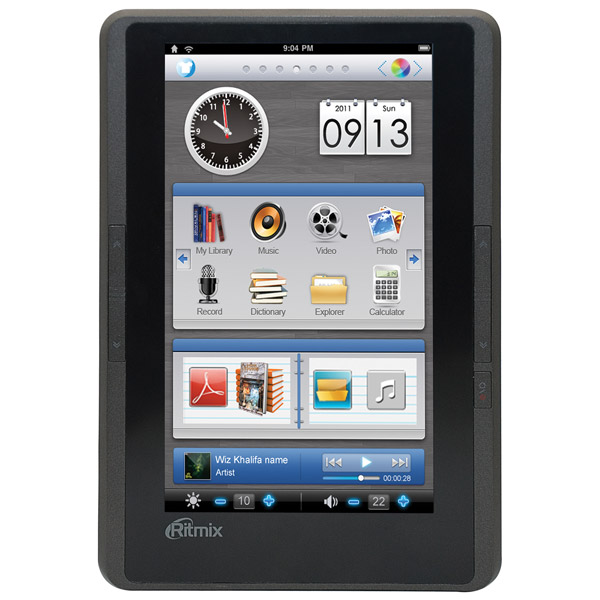 Электронная книга оснащена 7-дюймовым сенсорным TFT-дисплеем с разрешением 800x480. Она поддерживает основные популярные форматы медиафайлов, в том числе отображает видео стандарта HD 720p.