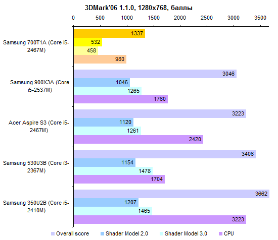 | Samsung 700T1A | 11,6″ | SSD | Intel Core i5-2467M: 1,6 (2,3) ГГц, 3 Мбайт L3, два ядра | 4 Гбайт DDR3-1333 | Интегрированная, Intel HD 3000 | н. д. | Win 7 HP 64 SP1 |