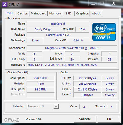 | Процессор | Intel Core i5-2467M: 1,6 ГГц (до 2,3 ГГц в режиме Turbo Boost); 2x256 Кбайт L2; 3 Мбайт L3; два вычислительных ядра |