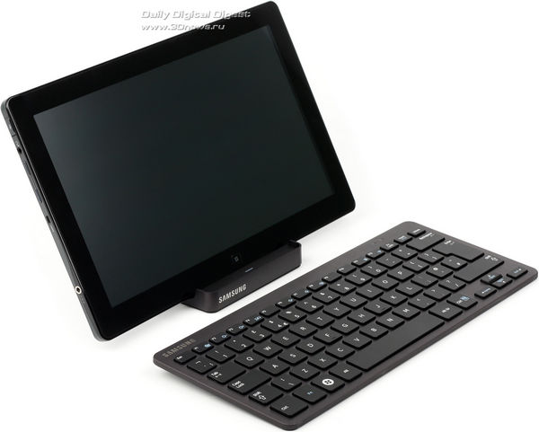 В Samsung хорошо понимают, что одним сенсорным дисплеем пользователь вряд ли обойдется. Поэтому предусмотрели для 700T1A Slate пару аксессуаров, позволяющих быстро трансформировать планшет в полноценное рабочее место. Самая важная добавка — это док-станция. Она устроена достаточно остроумно: в походном режиме превращается в компактный параллелепипед, который удобно помещается в кармане сумки, рюкзака или чемодана.