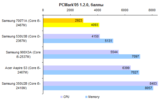 В бенчмарках Samsung Slate ощутимо не дотягивает до того уровня, который можно было бы ожидать, исходя из модели установленного в планшете процессора. Очевидно, на довольно-таки шустрый Core i5-2467M в данном случае накинута узда.