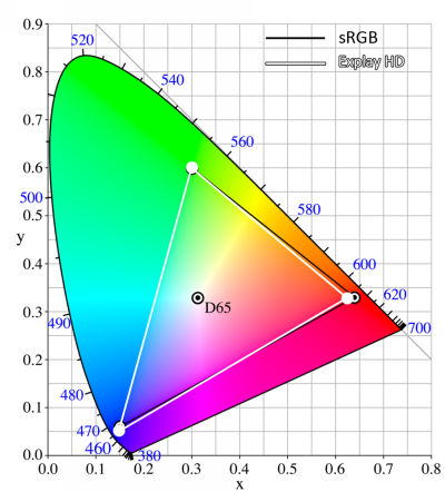 Explay HD — цветовой охват экрана (белый треугольник) в сопоставлении с цветовым пространством sRGB (черный треугольник)