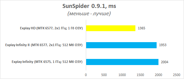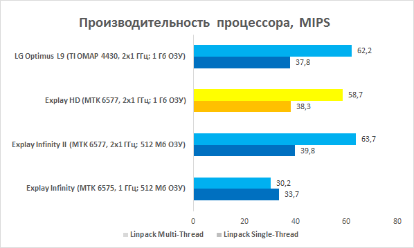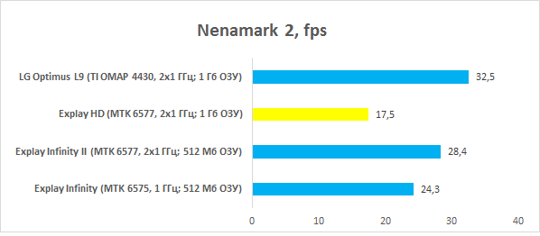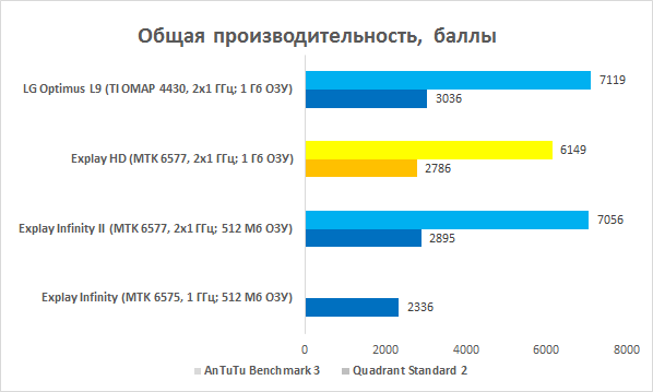 Мы уже не раз сталкивались с тем, что вычислительных мощностей хорошо зарекомендовавших себя «бюджетных» процессоров не хватает устройствам с экранами высокого разрешения. Explay HD — наглядный пример такой ситуации. Процессор MediaTek MT6577 обычно устанавливается в смартфоны с дисплеями низкого разрешения. В них чип проявлял себя хорошо, обеспечивал плавную работу и достаточно высокие оценки в синтетических тестах. Но стоило чипу попасть в Explay HD — и начались некоторые затруднения. Сам по себе смартфон работает неплохо, но устройству несколько не хватает возможностей процессора. Хотелось бы, чтобы Explay HD более шустро и гладко отображал анимацию операционной системы, оперативнее переключался между программами. Смартфон частенько «подергивает» картинку. Никаким серьезным зависаниям устройство не подвергается — просто не хватает гладкости, которую мог бы обеспечить более производительный процессор. Тем не менее по результатам тестовых заданий наглядно видно, что Explay HD старается не отставать от таких серьезных устройств, как LG Optimus L9, и это очень хорошо.