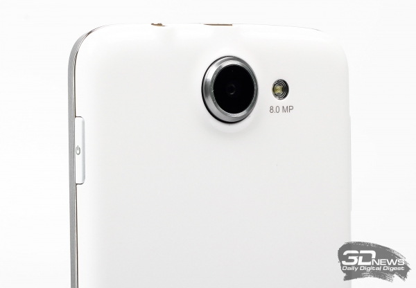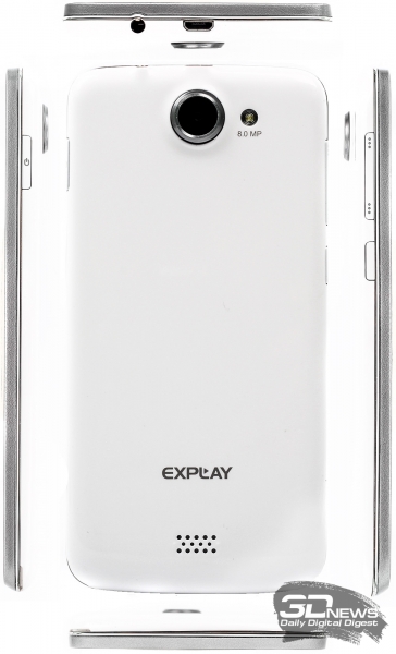 Корпус устройства полностью выполнен из пластика, и задняя крышка не является исключением. «Спинка» гаджета глянцевая, из-за чего устройство может проскальзывать в руках. К нам на тест приехала белая версия Explay HD, и на ней отпечатки пальцев практически незаметны. Однако если присмотреться, можно увидеть, что задняя панель смартфона собирает их крайне охотно. Вверху панели расположен на пару миллиметров выступающий объектив основной, восьмимегапиксельной камеры. Справа от него находится светодиодная вспышка. В нижней части «спинки» помещены логотип производителя и прорезь внешнего динамика.