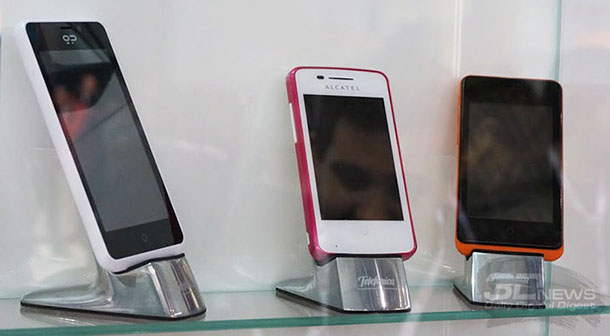 Кстати, на той же витрине за стеклом можно было видеть и выключенный аппарат для Firefox OS под маркой LG (возможно, это даже просто муляж). Дизайн этого смартфона, возможно, наиболее строг из представленных до этого продуктов. Данных об аппарате, впрочем, тоже никаких нет:
