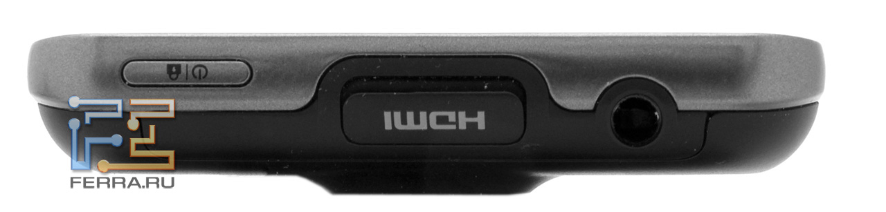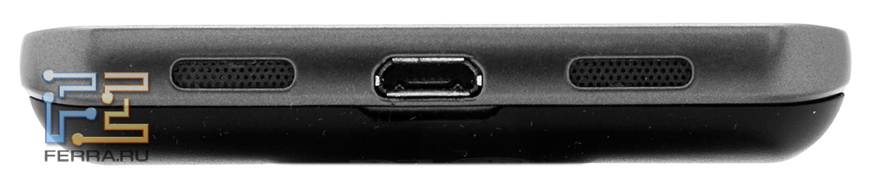 На нижнем торце аппарата находятся два отверстия динамиков и разъём microUSB. На верхнем, помимо уже упомянутой клавиши питания, расположились 3,5-мм разъём для наушников и закрытый заглушкой порт mini-HDMI.
