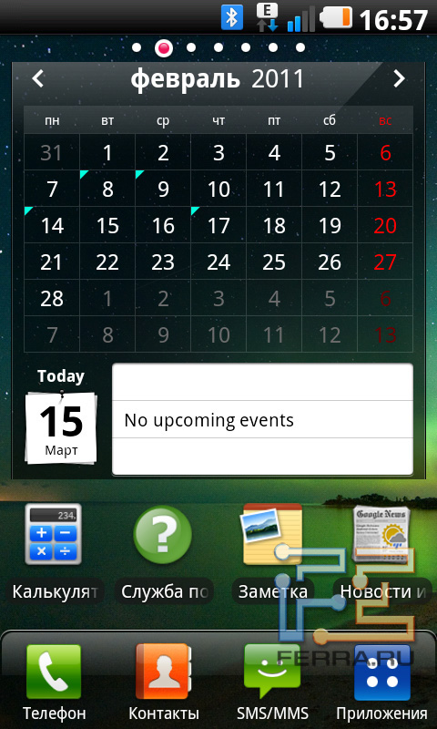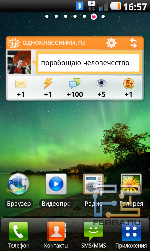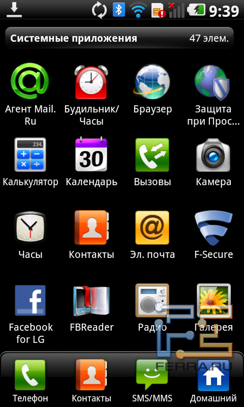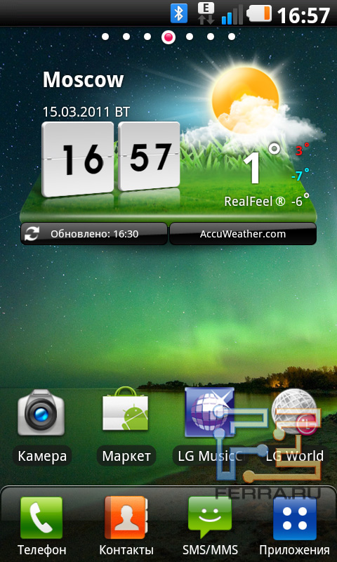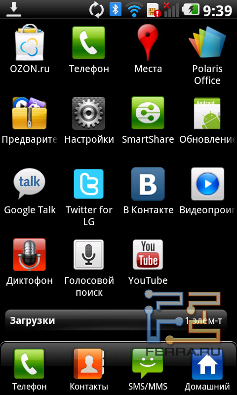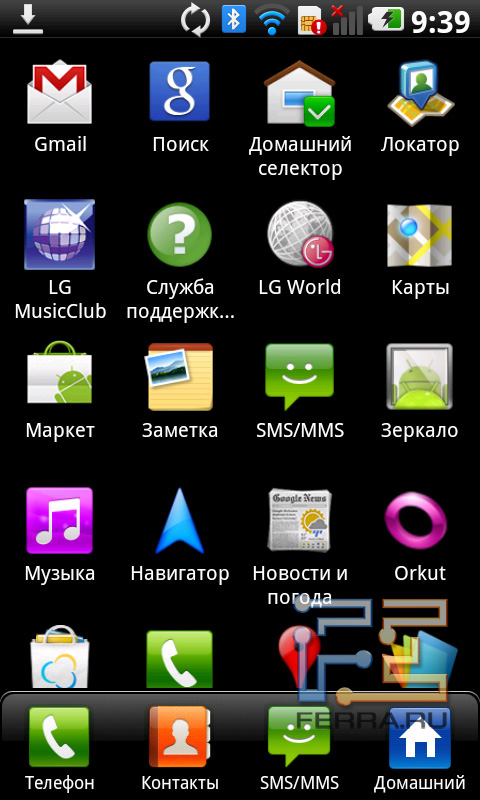 Твёрдую пятёрку LG заслужила за доработку программной части. На рабочем столе (он разделён на пять экранов) появилась куча красочных виджетов, а список программ ломится от программ для работы с отечественными интернет-сервисами. Лишь изредка в интерфейсе встречаются небольшие ошибки перевода, но они совсем не портят общую картину.