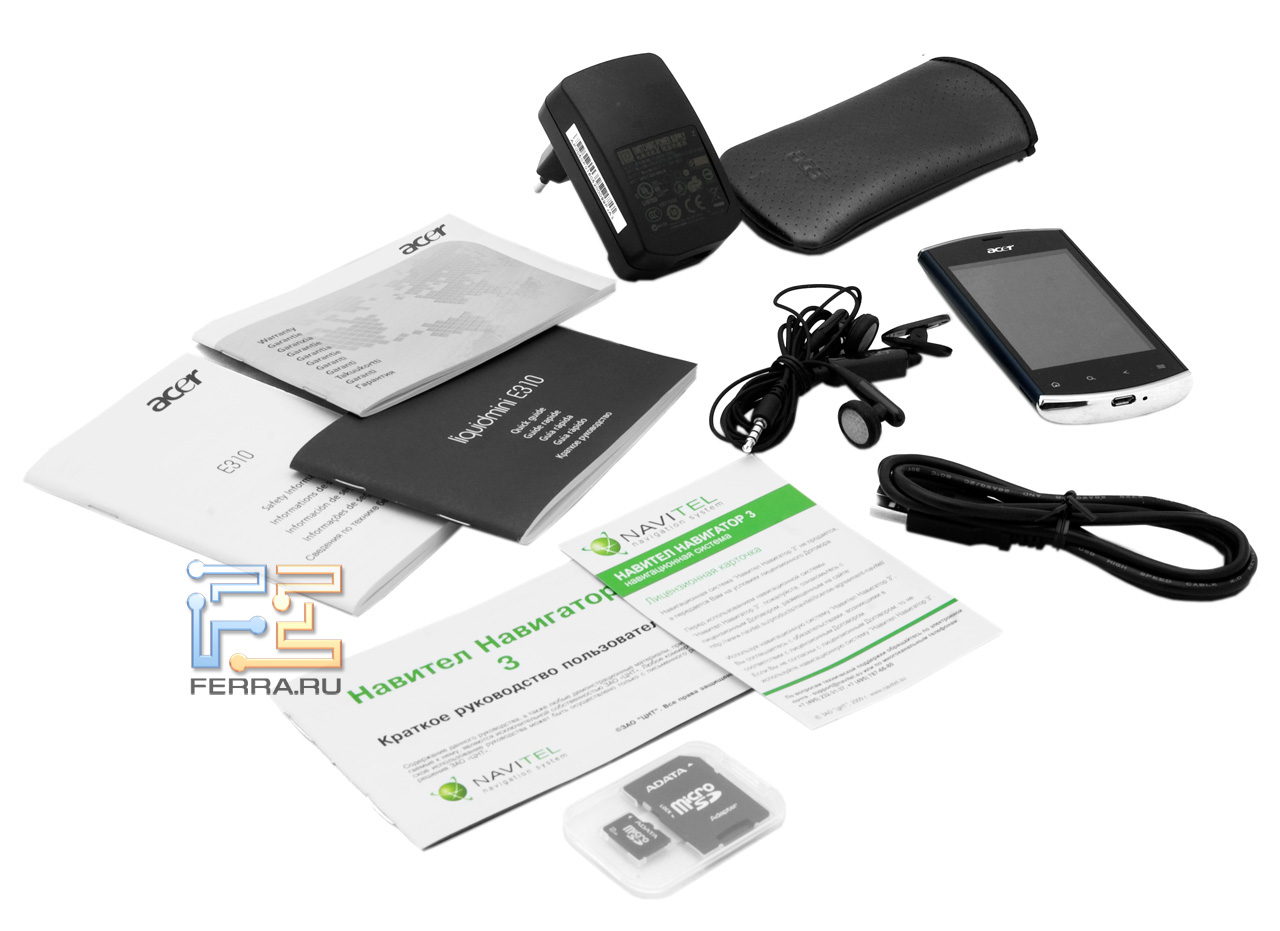 В комплекте со смартфоном поставляются чехол-носок, карта памяти на 2 ГБ, зарядное устройство, кабель USB-microUSB и карточка с кодом для Навител Навигатора.