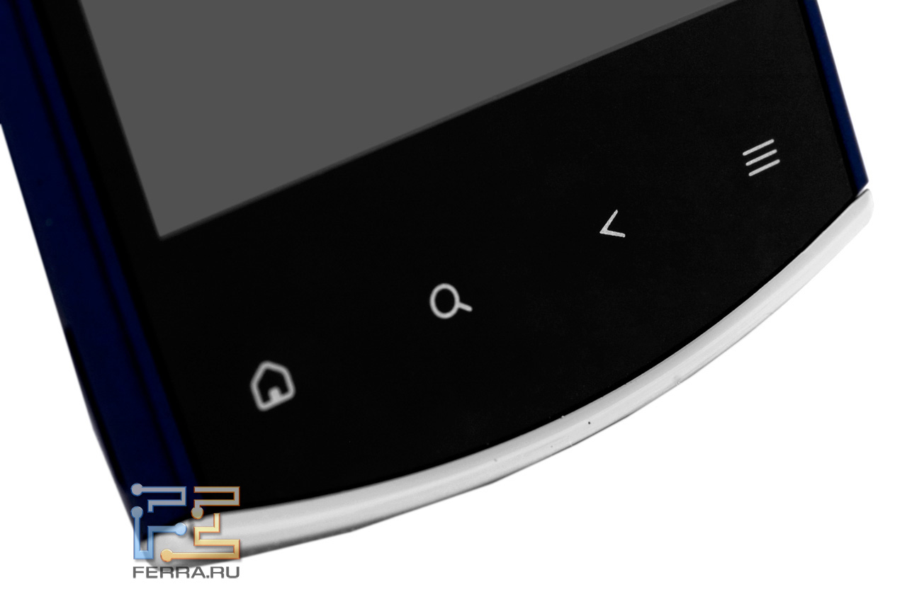 Под экраном расположен блок сенсорных клавиш: Домой, Поиск, Назад и Меню. Все они имеют подсветку, которая почему-то гаснет спустя несколько секунд – и даже прикосновение к экрану её не пробуждает. Получается, чтобы увидеть клавиши, нужно сначала вслепую нажать на одну из них – какая под палец подвернётся – а потом разгребать последствия.