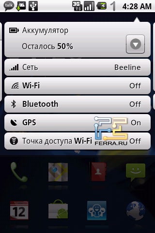 Изменена и область уведомлений, сюда Acer тоже добавила измерений. Привычным жестом из-под верхней кромки экрана вытягивается опять-таки фирменный блок управления беспроводными интерфейсами в компании с индикатором заряда. Сдвинув его в одну сторону, можно найти привычный список уведомлений, сдвинув в другую сторону — часы и кнопку для перехода к настройкам будильника.