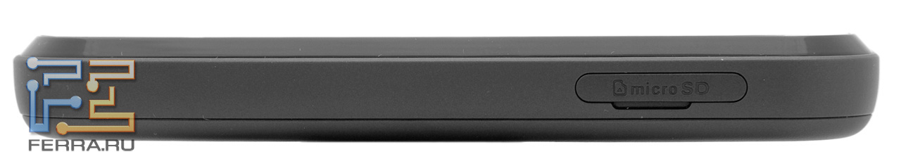 На правом боку расположены клавиши управления громкостью и разъём micro-USB, прикрытый резиновой заглушкой. Похожий разъём для карт памяти microSD можно найти на левом боку.