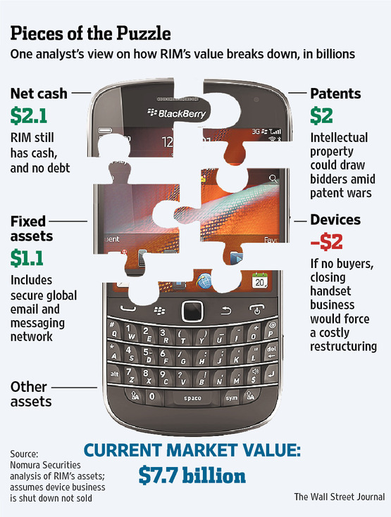 Сама RIM не комментирует эти слухи. Другие данные говорят о том, что RIM может решиться на распродажу убыточных подразделений, стараясь сфокусироваться на своих сильных сторонах. Сообщается, что компания даже может пойти на реализацию своего телефонного подразделения, полностью занявшись корпоративными сетями и службами.