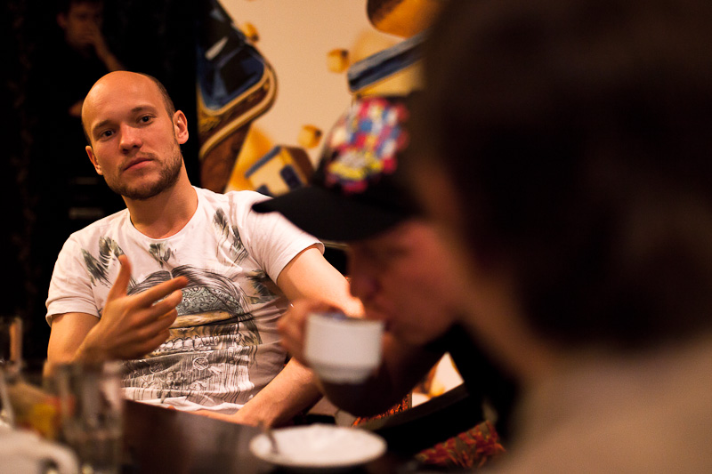 Владимир: В гастрономе, в бакалее я брал как-то колбасу. Подходит Антон, опережает меня в очереди и говорит: «Дайте мне бутылку водки». Я говорю: «Ты че, водку пить будешь?» — «Да». — «А у меня колбаса есть». Все, пошли, забухали.
