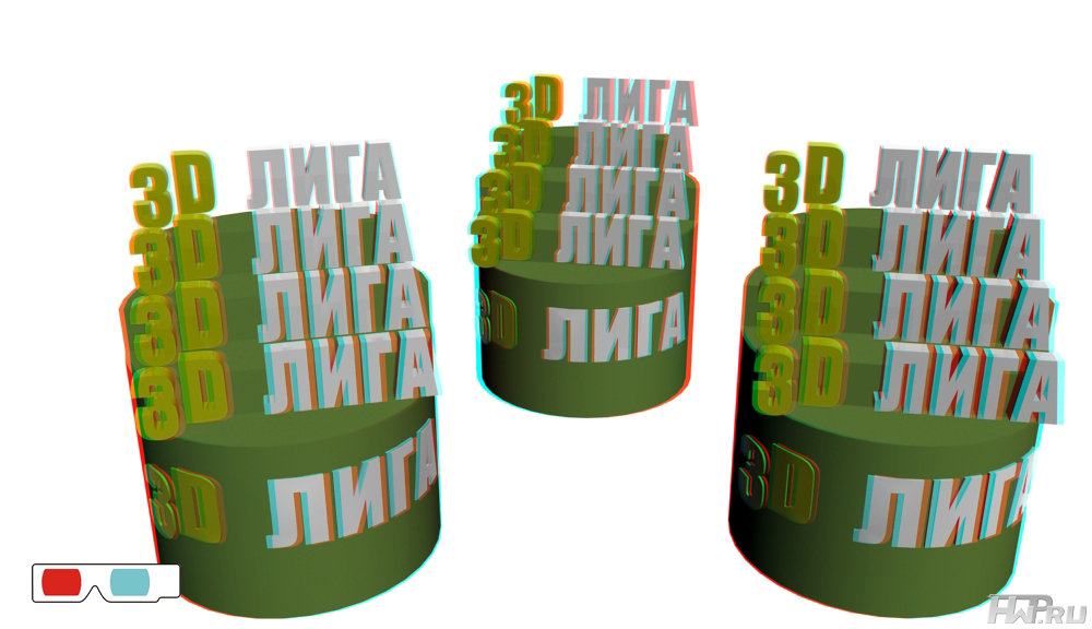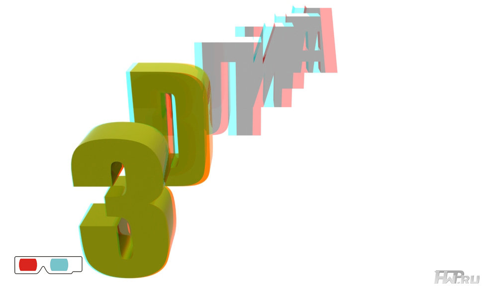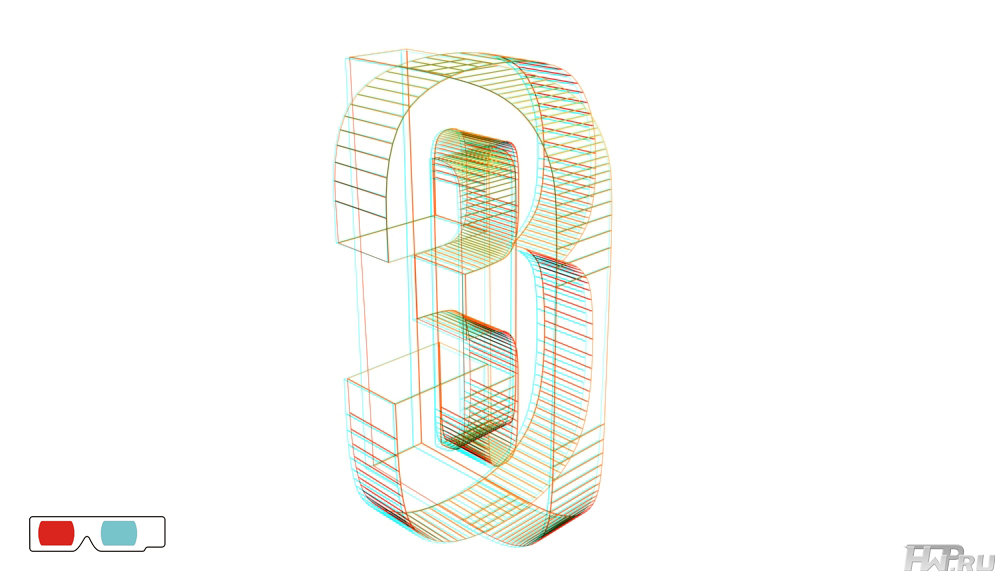 Большая информативность отдельных зон экрана (для сложных объектов). В 3D режиме сложный объект выглядит понятно, то есть нагромождение графики выглядит, как понятная геометрическая фигура. В 2D режиме нельзя использовать сложные геометрические построения, так как они будут не читаемы. На картинке изображено всего два символа. Их сложно понять в 2D. Если же вы взгляните на них в 3D анаглиф (сине-красных) очках (см. картинку), то вы разберете надпись 3D. Особенно это видно в научных задачах (напр., сложных химических соединениях), которые нельзя понять без 3D.