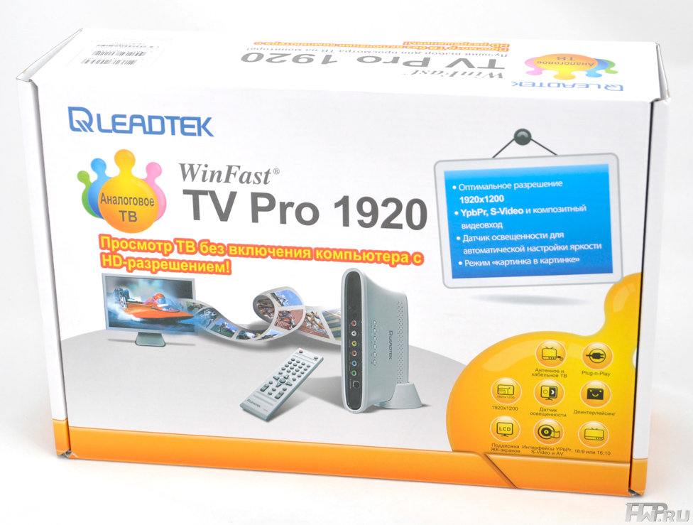 Leadtek WinFast TV Pro 1920 – это простой, недорогой и качественный тюнер. Для своей стоимости, не превышающей 2000 рублей, аппарат обладает хорошим набором функций, умеет работать с большими разрешениями, выдает отличную картинку и оснащен настраиваемой функцией аппаратного подавления шумов. Добавьте сюда компонентный видеовход, русское меню и высокое качество сборки. От опыта работы с этим устройством остаются лишь положительные ощущения, не говоря уже об отличном дизайне ТВ-приемника, отлично сочетающемся с любым интерьером.